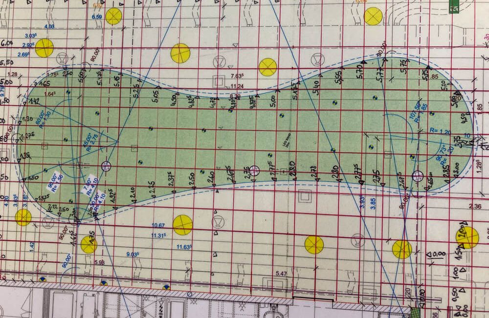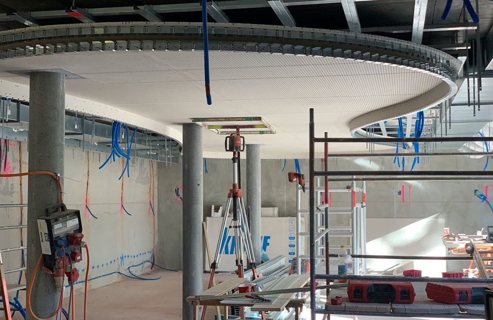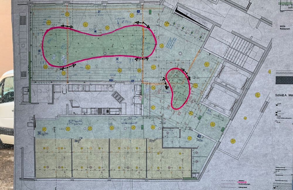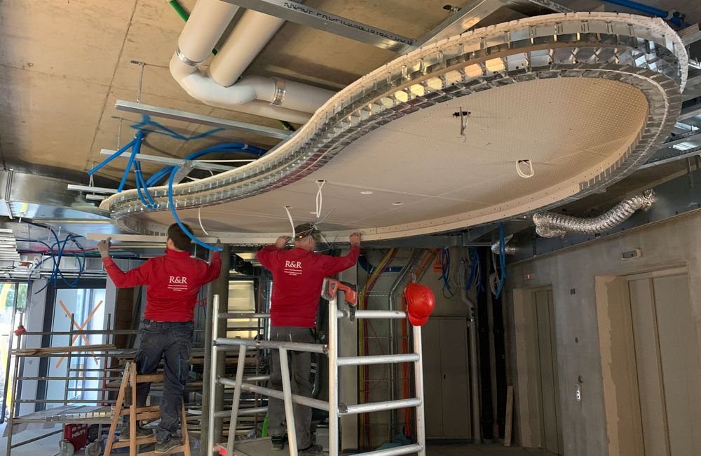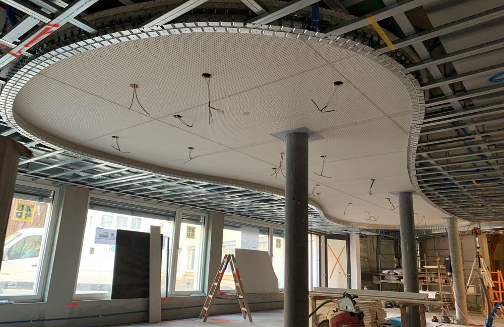 Im Projekt «Altersheim Solviva Thun» sollte im Speise- sowie Aufenthaltsraum eine spezielle Atmosphäre durch hinterleuchtete Deckenabsätze mit erhöhten Schallschutzanforderungen auf beiden Ebenen erstellt werden. Die Herausforderung lag in den speziellen Formen der Deckenvertiefungen, die nierenförmig bzw. elliptische Rundungen haben sollte. Die einzelnen Radien der verschiedenen Rundungen lagen jeweils ausserhalb des Gebäudes, da diese bis zu 12 m aufwiesen. Mit der herkömmlichen Art des Einmessens per Schnur oder Laser war es aus diesem Grund nicht möglich. Somit erstellten wir ein massstäbliches Raster in quadratischer Form, legten dies über den Deckenspiegelplan 1:50 und konnten somit die Schnittpunkte der verschiedenen Radien exakt bestimmen, die Deckenformen vor Ort einmessen und die Abschlusselemente entsprechend selbst produzieren.